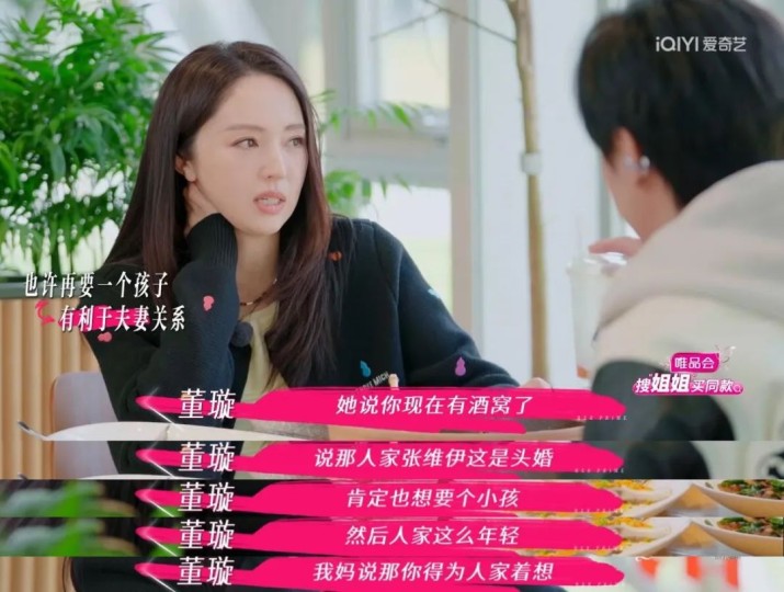 然而,在第四期节目播出后,原来是董璇在饭桌上主动说起母亲提及他们是否该要孩子的话题,董璇曾经的婚姻生下了女儿小酒窝,而张维伊是头婚未育,家人担心如果他们不生个孩子,对于男方并不公平。